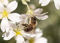 macro van honingbij aan het werk op witte bloemetjes