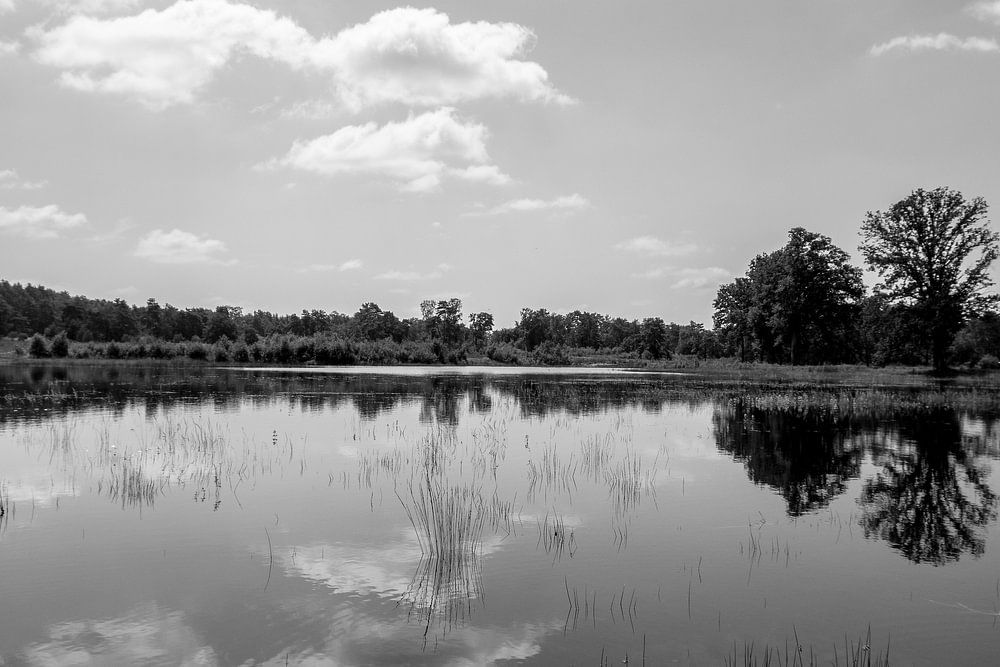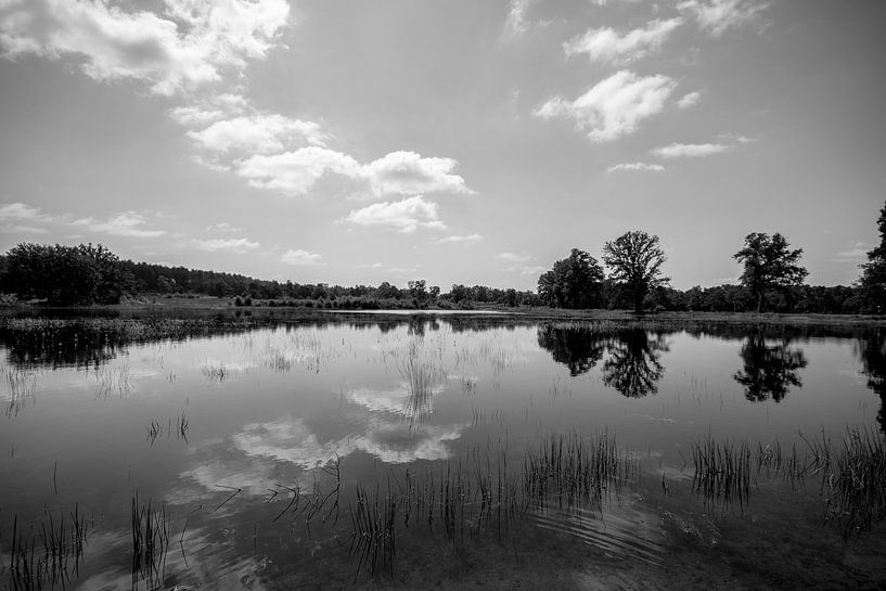 een leuke reflectie van de wolken in de natuurvijver .hier vond ik wel om deze om te zetten naar zwart wit wat ook wel weer appart is en soms ook mooi in een strak interieeur