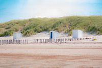 drie strandcabines op het strand van Domburg, waarvan de middelste cabine een blauwe deur heeft