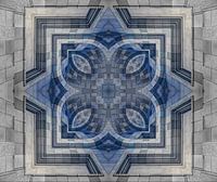 De afbeelding toont een symmetrisch, mandala-achtig patroon dat wordt gedomineerd door een mix van geometrische en architecturale vormen. In het midden zijn verstrengelde cirkels en diamanten te zien, omlijst door in elkaar grijpende lijnen en steenstructuren. De kleuren zijn voornamelijk blauw en grijs, wat het werk een koele, kalme…