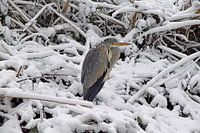 In park Molenvliet in de stad Woerden zit een baluwe reiger in de sneeuw langs de slootkant.