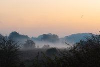 landschap in het blauwe uur voor de zon opkomt, waar de nevel over de grond hangt, wat voor een feeërieke sfeer zorgt