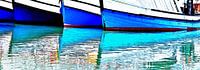 Close-up met blauwe vissersboten in de haven van Hout Baai