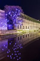 Het kunstwerk ""Blauwe vogels"in Gent in de avond met een mooie reflectie in de stadsgracht. Het kunstwerk bestaat uit blauwe origamivogels die in de boom hangen. Dit kunstwerk is gemaakt door ontwerpstudio Pitaya en was 1 van de hoogtepunten van het Lichtfestival Gent in 2012. De stad Gent kocht het kunstwerk definitief…