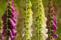Het is lente en het vingerhoedskruid doet zijn best om zijn lange stengels uitbundig te laten bloeien in prachtige kleuren. Hier witte en paarse bloemen.
