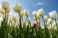Tulpen op het veld in de polder bij Dronten. Dit is altijd prachtig in het voorjaar als de tulpenvelden weer in bloei staan. Op deze foto witte tulpen met een verdwaalde rode tulp er tussen. De mooie blauwe lucht met lichte wolkjes maakt het voorjaarsgevoel helemaal af.