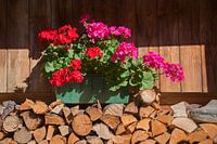 bloembak met rode en roze geranium op gestapeld brandhout voor een landelijke houten boerderij
