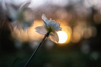 close up van de onderkant van een witte narcis, met op de achtergrond de opkomende lentezon