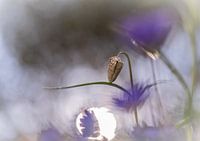close up van een kievitsbloem die nog niet open is, omringd door wazige paarse bosanemonen, met een grijze bokeh achtergrond