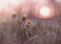 close up van een bevroren paardenbloem tussen de grassprietjes, met een warme roze fotobewerking en de opkomende zon in de achtergrond