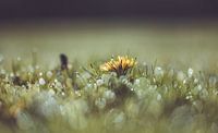 close up van een paardenbloem tussen met dauwdruppels bedekte grassprietjes in het zonlicht, wat voor een prachtige bokeh zorgt