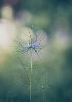 close up van een blauw juffertje in 't groen, met een zachte groene bokeh achtergrond