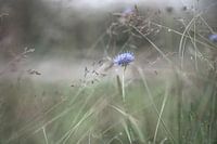 close up van een Jasione montana, ofwel zandblauwtje, een blauw bloemetje dat in de zomer voorkomt op de heide