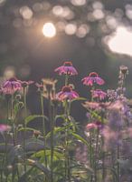 close up van een groepje roze Echinacea, ofwel zonnehoed, badend in het zonlicht van de vroege ochtend