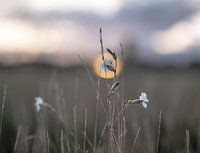 close up van een wit wildgroeiend zomerbloempje, met op de achtergrond de opkomende zon