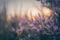 close up van een bloeiende heideplant, met op de achtergrond de oranje lucht door de opkomende zon