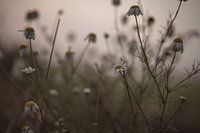 close up van kamillebloemen in de mist, met een fotobewerking in een moody stijl