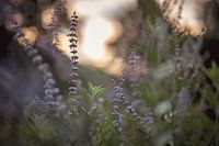 close up van een Perovskia atriplicifolia, ofwel Russische salie, met een warme bokeh achtergrond door de opkomende zon