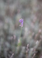 close up van een enkel lavendel bloempje tussen de uitgebloeide lavendel, met een grijze bokeh achtergrond