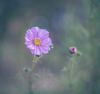 close up van een roze cosmos bipinnatus, een herfstbloeiende bloem, met een wazige blauw groene achtergrond