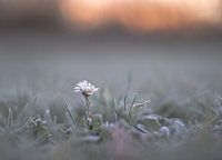 close up van een madeliefje bedekt met rijp, in het bevroren gras, met de zonsopkomst op de achtergrond
