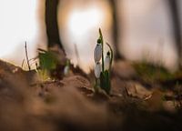 close up van een drietal sneeuwklokjes, met op de achtergrond het gouden licht van de opkomende zon