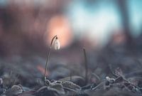 close up van een enkel sneeuwklokje op een koude winterochtend, met een pastelkleurige achtergrond