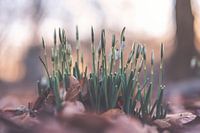 close up van een groepje piepkleine sneeuwklokjes in het bos, met het gouden licht van de zonsopkomst op de achtergrond
