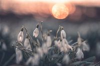 close up van een groepje sneeuwklokjes in het gouden licht met op de achtergrond de opkomende zon
