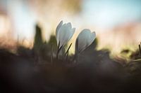 close up van twee witte krokussen, met een donkere foto nabewerking, en op de achtergrond het warme licht van de opkomende zon