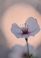 macro opname van de meeldraden en bloemblaadjes van een lichtroze bloesem van een prunus, met de zachte en warme kleuren van de zonsopkomst op de achtergrond