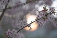 close up van een tak van een prunus met prachtige lichtroze bloesem, met op de achtergrond de opkomende zon