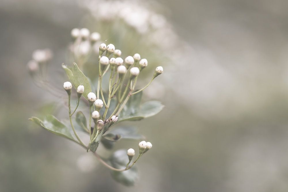 close up van de witte bloesem van een tak, waarvan de bloemetjes nog niet open zijn, met een grijsgroene bokeh achtergrond