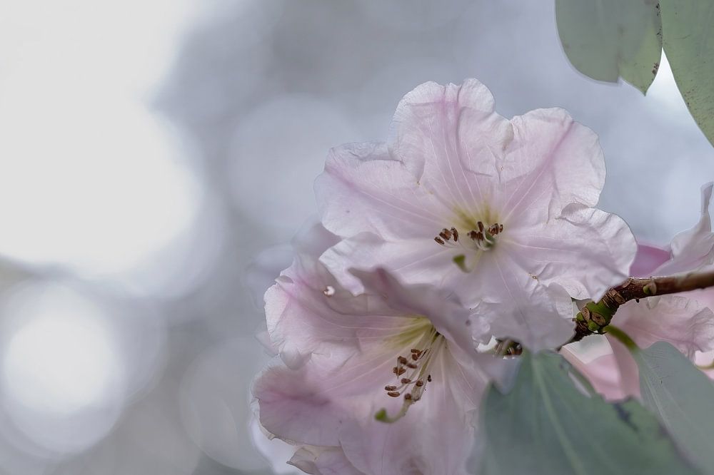 close up van de bloem van een lichtroze rododendron, met een pastelkleurige bokeh achtergrond