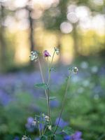 portret met de close up van een lichtroze akelei, met een wazige achtergrond met groene, paarse en gouden tinten