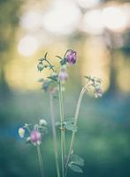 Close up van een lichtroze akelei. De foto is gemaakt met een groot diafragma, wat ervoor zorgt dat de pastelkleurige achtergrond wazig is.