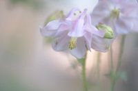 close up van een lichtroze akelei, met een zachte pastelkleurige bokeh achtergrond