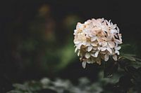 close up van een witte herfstbloeiende hydrangea, met een donkere groene achtergrond