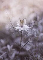 Portret van een witte Nigella, ofwel juffertje in het groen, met een bijna kleurloze foto nabewerking.