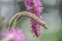 close up van een sanguisorba hakusanensis, met dauwdruppeltjes en een pastelgroene bokeh achtergrond