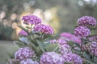closeup van een roze hortensia, met een zonnige bokeh achtergrond, en een pastelkleurige foto nabewerking