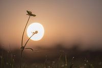 close up van een boterbloempje, in de vroege ochtend, met op de achtergrond de opkomende zon