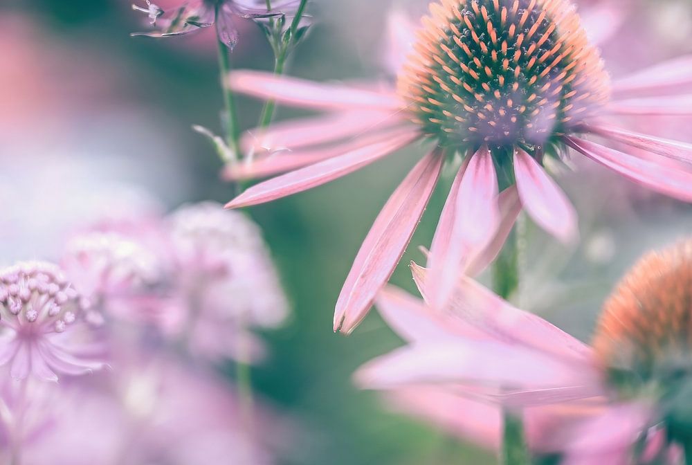 Meervoudige belichting , waar twee foto's over mekaar werden gelegd. Eén foto van een roze zonnehoed, en de ander van zeeuws knoopje.
