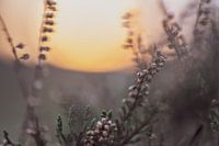 close up van de uitgebloeide heideplant die in rust is tijdens de winter, met op de achtergrond de opkomende zon
