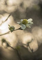 Close up van de witte bloesem van een lentebloeiende boom, met een zachte lichtbruine bokeh achtergrond.