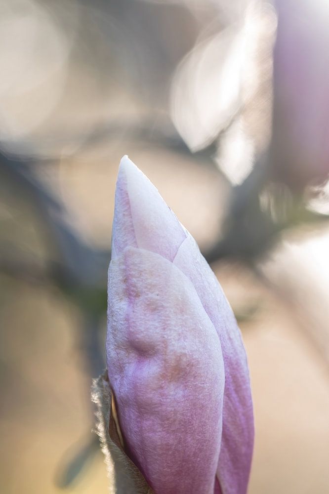 Close up van de roze bloem van een magnolia boom, met een warme zonnige pastel oranje achtergrond.