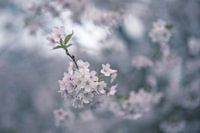 Close up van een tak van een prunus boom met witte bloesem. De foto is bewerkt in koude pastelkleuren.