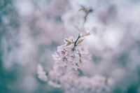 Close up van een tak van een prunus boom met witte bloesem. De foto is bewerkt in koude pastelkleuren.