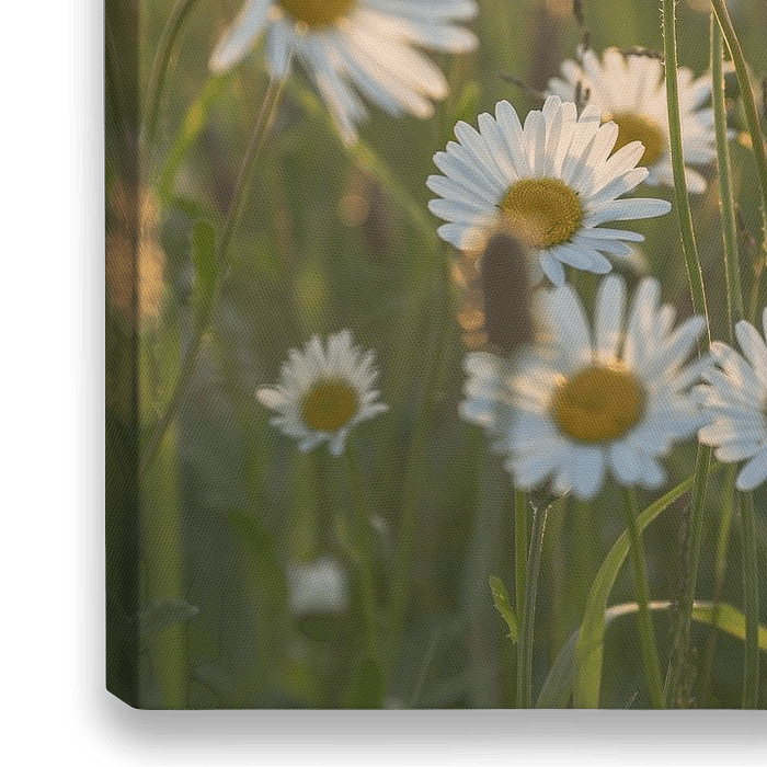 Close up van een veldje met wilde margrieten, badend in het gouden licht van de opkomende zon.