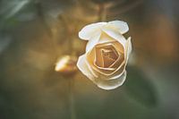 Close up van een lichtgele roos, met een goudgroene wazige achtergrond.